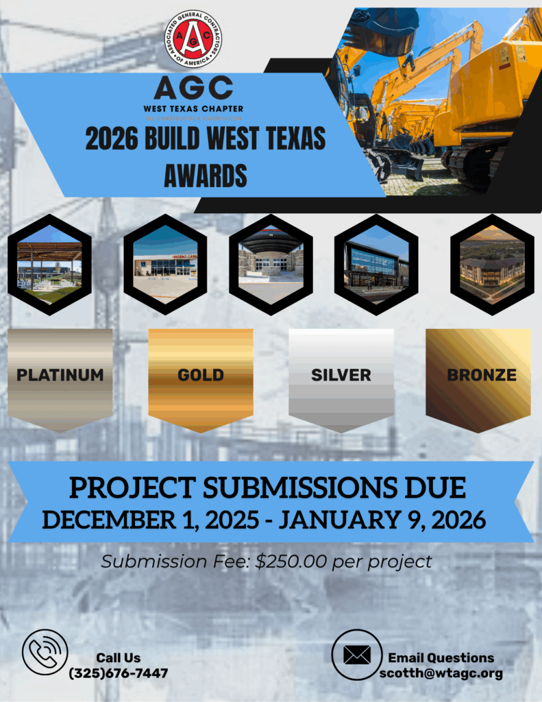 Submission Packet & Guidelines | Build West Texas Project Submission Form | Build West Texas Individual Nomination FormĀ West Texas Chapter AGC Member Directory | 2025 Winners