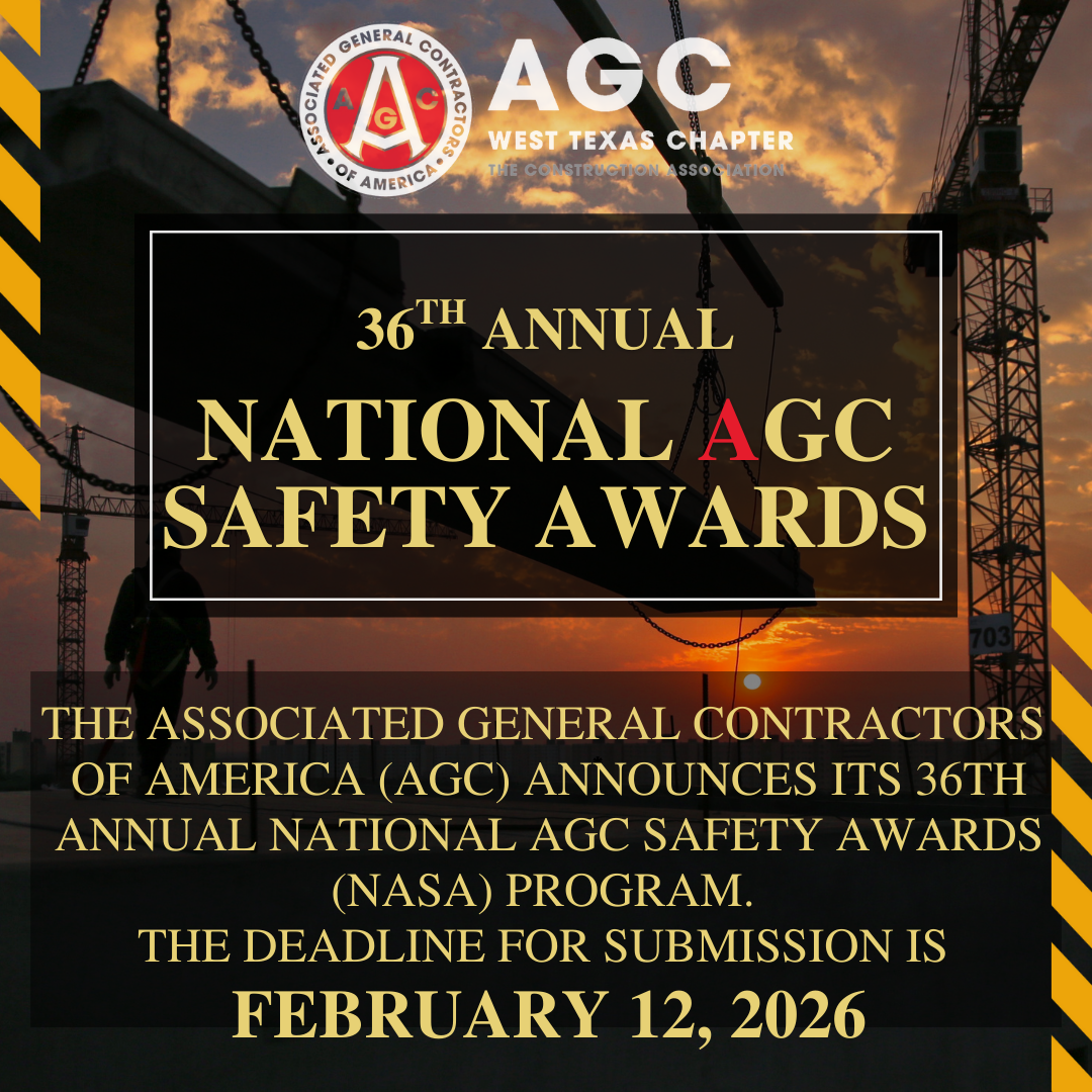 NEWS & EVENTS WTAGC MEMBER REQUEST FORM FOR UPDATED FLEET AND SAFETY MANUALS DECEMBER 31 SUBMISSION DEADLINE FOR WTAGC MEMBER DIRECTORY PHOTO CONTEST JANUARY 9 SUBMISSION DEADLINE FOR 2026 BUILD WEST TEXAS AWARDS FEBRUARY 12 SUBMISSION DEADLINE FOR NASA 2025 SAFETY AWARDS MARCH 31 SUBMISSION DEADLINE FOR 2026 WTAGC SCHOLARSHIP PROGRAM