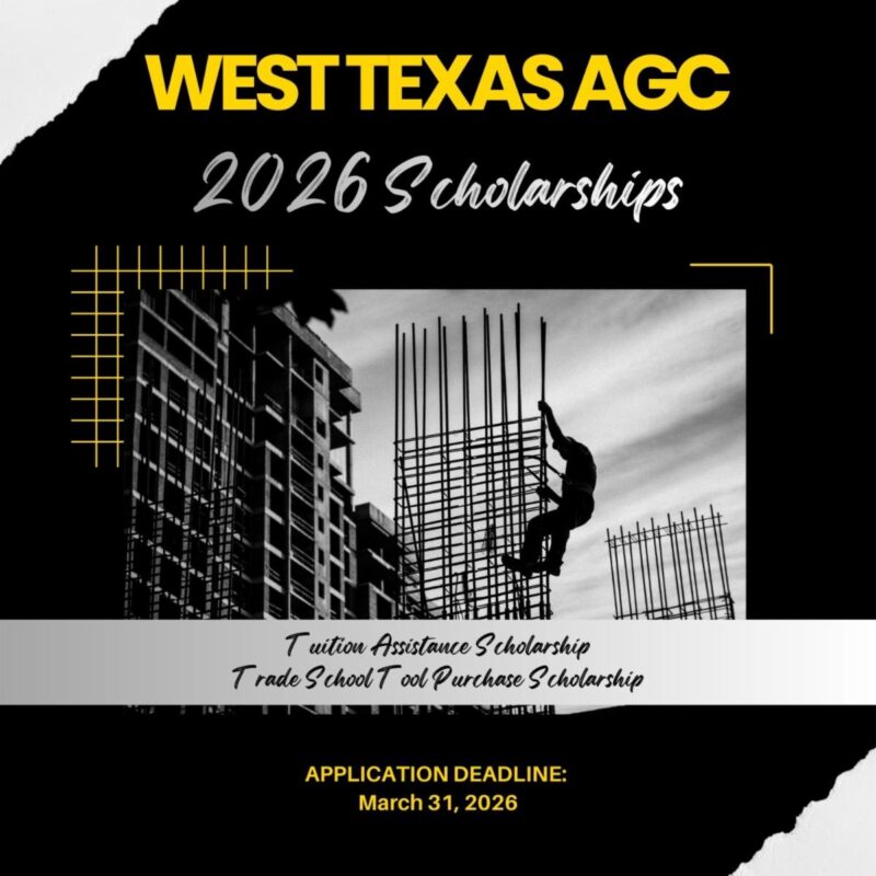 The generous sponsorships and donations of time from our membership and the industry for our annual golf tournament and clay shoot have allowed the West Texas AGC Chapter to develop a scholarship program that offers an “Annual” scholarship to graduating seniors, those in technical school and even students currently in a four-year college program. We also offer scholarships to an incoming student or currently enrolled student at a technical school or university that exhibits a need for scholarship assistance in obtaining tools and equipment in relation to the “tool list” as provided by the technical school for a construction-related degree program or course of study. Scholarship applications submitted by the March 31, 2026 deadline will be reviewed in the coming months and the recipients will be contacted this summer.